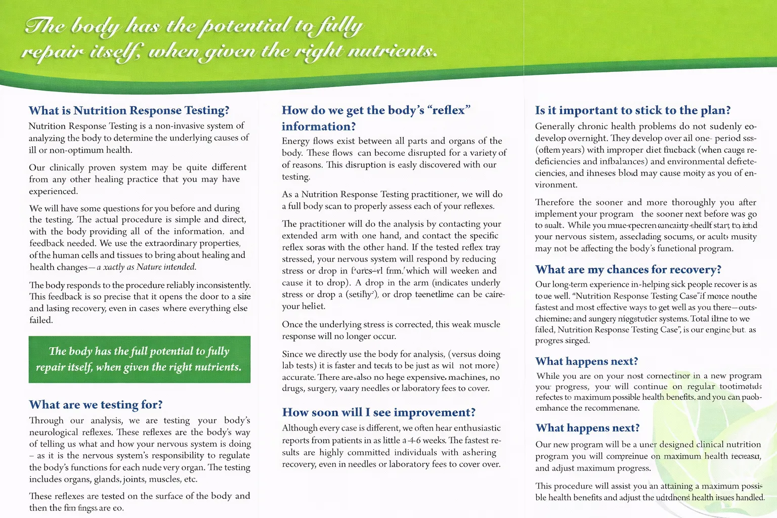 Nutrition Response Testing is a non-invasion system of analyzing the body to determine the underlying causes of ill or non-optimum health.